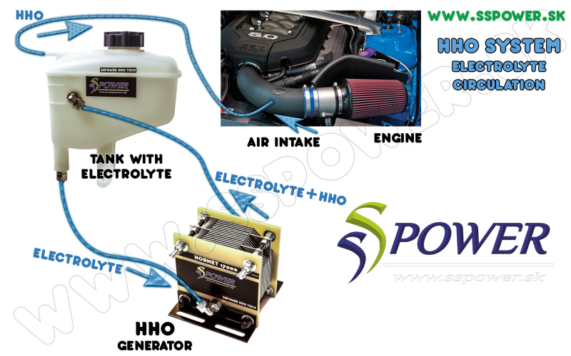 This system, in case an automatic level top-up system is not included, can be configured to indicate a low electrolyte level in the tank so that the first light indicator illuminates for information only when the electrolyte level is low, but the entire HHO system continues to run. However, when the electrolyte level in the tank reaches a critical level, the second light indicator also illuminates and the entire HHO system automatically shuts down.